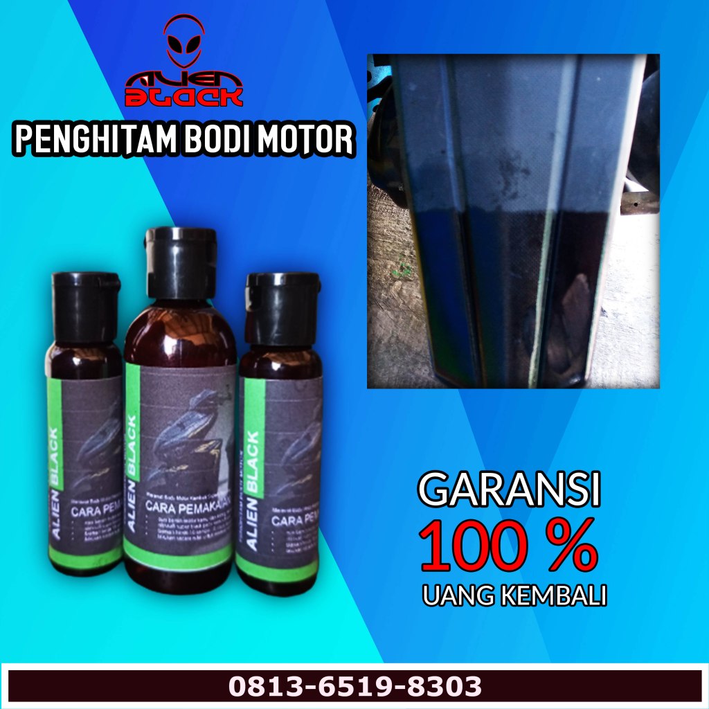 KELEBIHAN ALIEN BLACK 1. Plastik langsung menyerap cairan ALIEN BLACK sehingga hasil tidak belang 2. Hitam pekat 3. Kilap natural 4. Permanen 5. Tidak lengket 6. Anti debu 7. Mengurangi lecet dan baret 8. Efek dan talas, air tidak bisa nempel, cuci bersihkan cukup di lap kain basah saja.